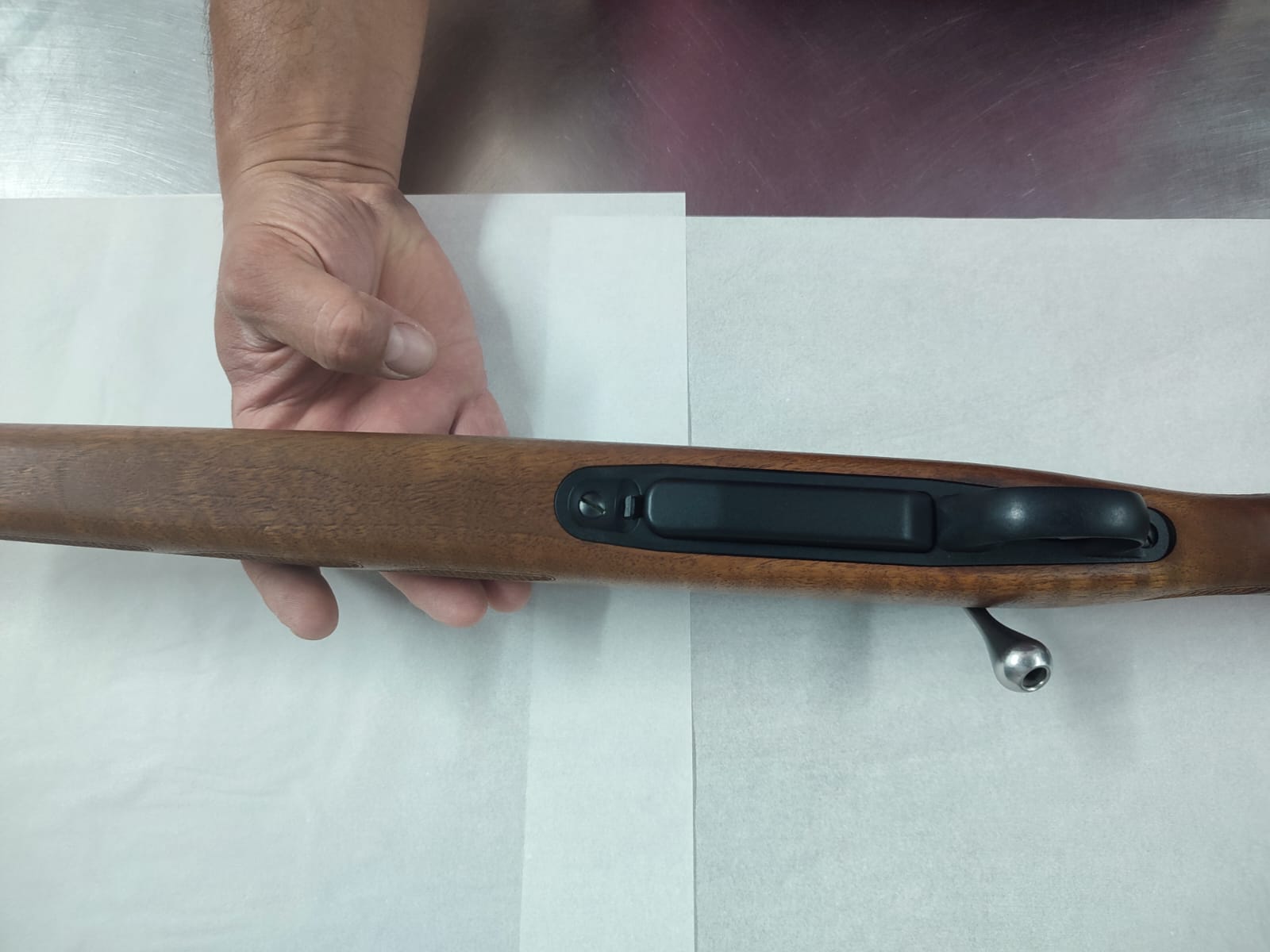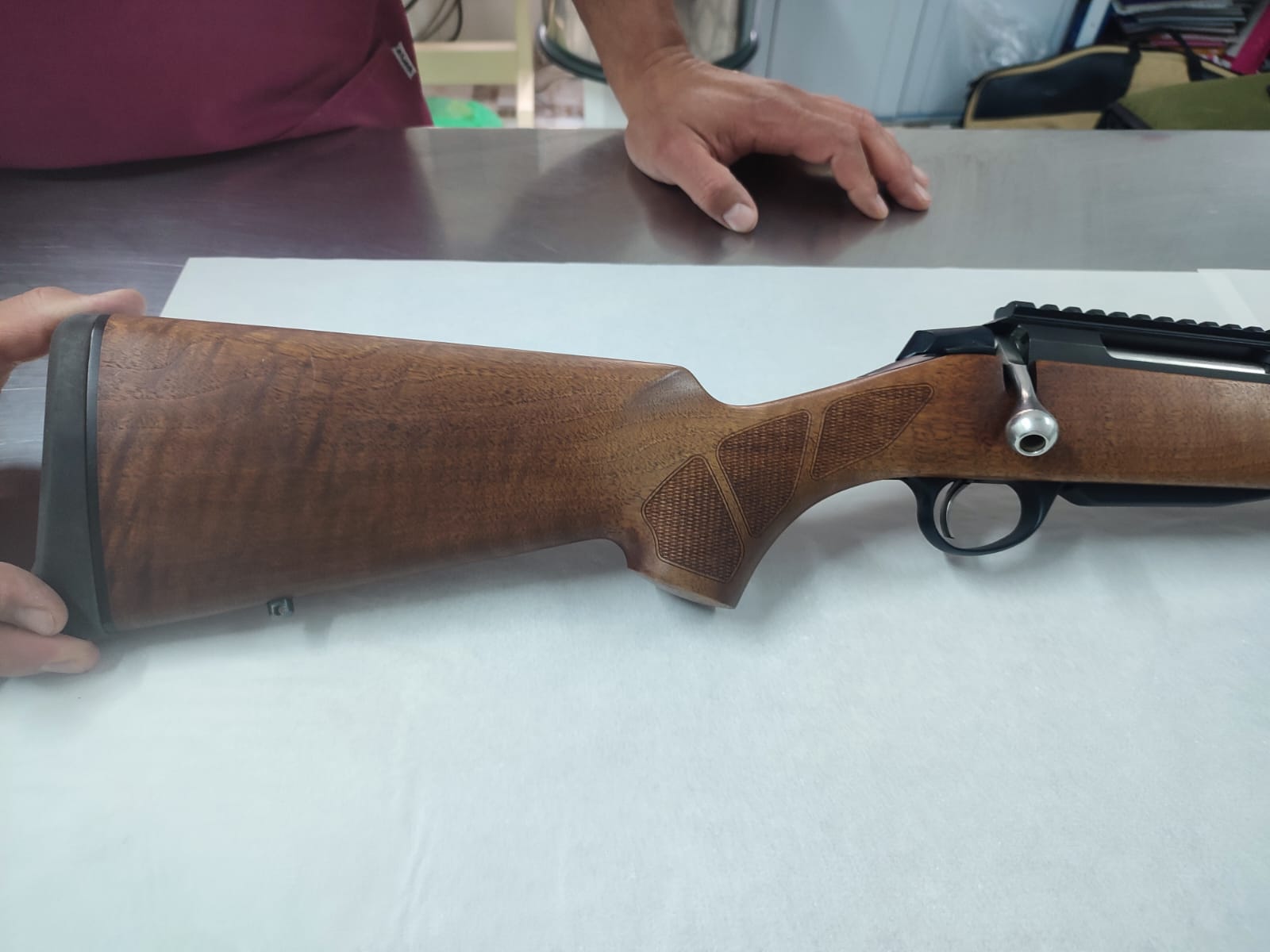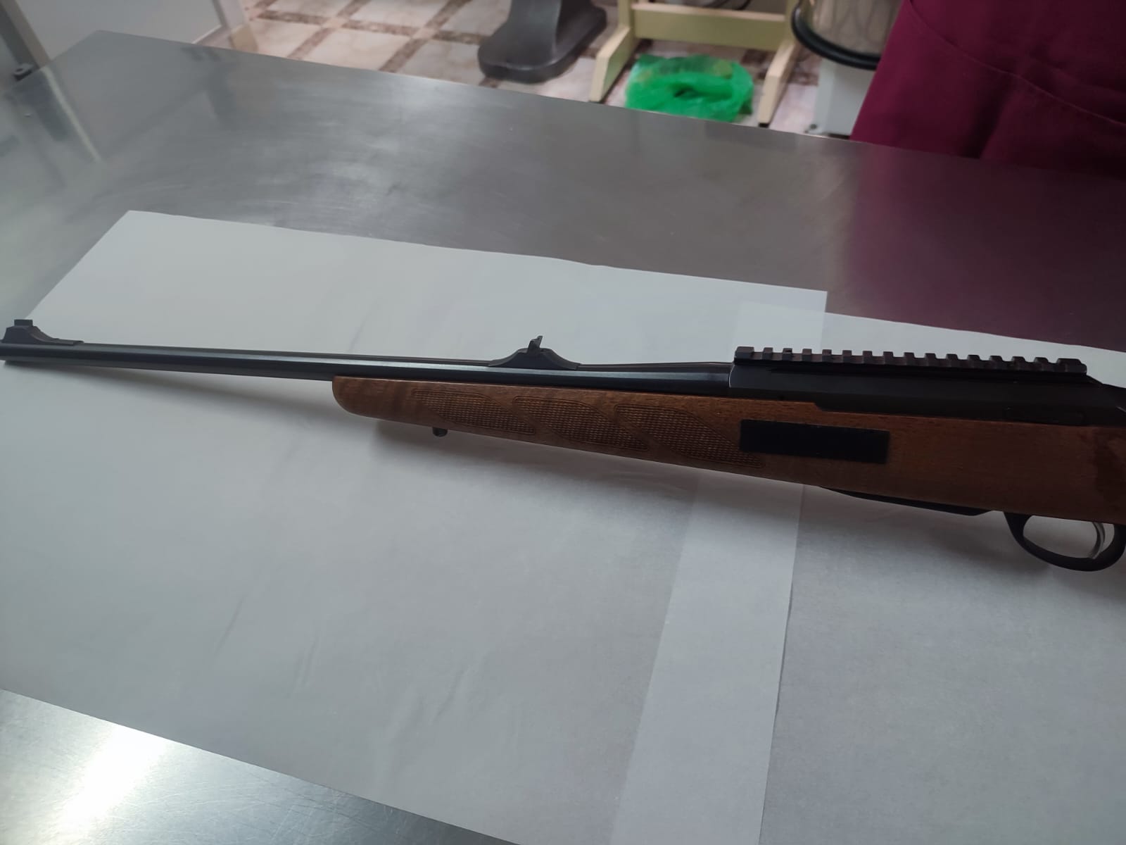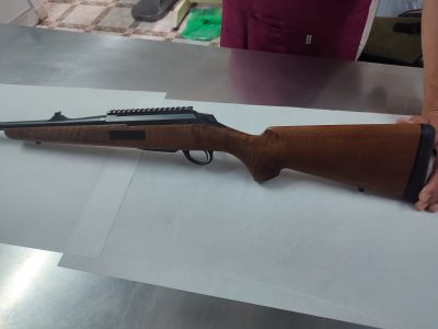 Precioso rifle de cerrojo, marca Tikka T 3, calibre 243w es el modelo de madera. El cerrojo, es muy suave y rápido de accionar. Tiene en la nuez un punto rojo cuando está el cerrojo montado. El gatillo es regulable en dureza. El cargador es extraíble. Su cañón es de 57 cm de largo, está flotado y tiene punto y alza. Tiene un carril incorporado para poder montar cualquier visor.